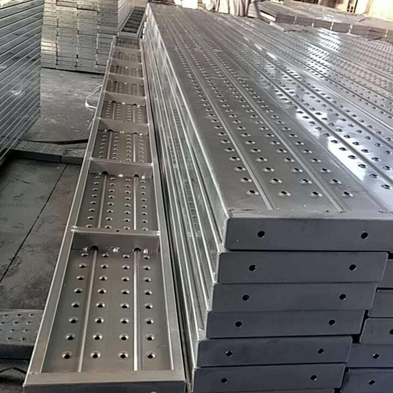 钢跳板是一种新型建筑施工用具的材料。一般称为钢制脚手板,建筑钢跳板,钢踏板,镀锌钢跳板,热镀锌钢踏板。用途广泛:建筑业,造船业,石油平台、电力等行业 钢跳板具有防火、防积沙、重量轻、耐腐蚀、耐碱且抗压强度高、表面凹凸孔、两侧工字型设计效果比同类产品尤其显著,孔距整齐成型规范、外形美观、经久耐用。底部特有的漏沙孔工艺起到了防积沙作用。使用钢跳板时,搭建脚手架的钢管可以适当减少,并能提高搭建效率。价格比木板低,多年后报废仍可回收35%-40%的投资等优点。 产品优势 钢跳板 回收率高,运用年限长。 钢跳板 表面的排凸孔,起到防滑、防变形。中间加强板增加了牢度和强度、使其外型美观大方、坚固耐用。 钢跳板材 通过热镀锌技术,运用寿命可达5-8年左右。 运用钢跳板已成为国内外的一种趋势,为施工作业的方便与快捷,起了很大作用。